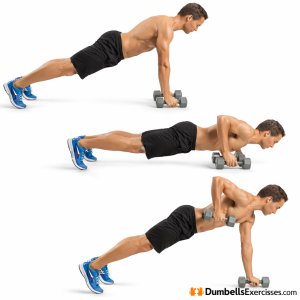 - Grip the dumbbells and assume a high plank position